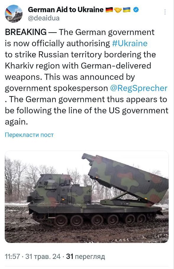 «В последние недели Россия готовила, координировала и осуществляла атаки с позиций в районе Харькова, в частности, с непосредственно прилегающей к российской границе территории. Мы убеждены, что Украина имеет право в соответствии с международным правом защищаться от этих нападений. Украина может использовать поставленное для этой цели оружие в соответствии со своими международно-правовыми обязательствами, в том числе и поставленное нами», — сказал Хебестрейт.