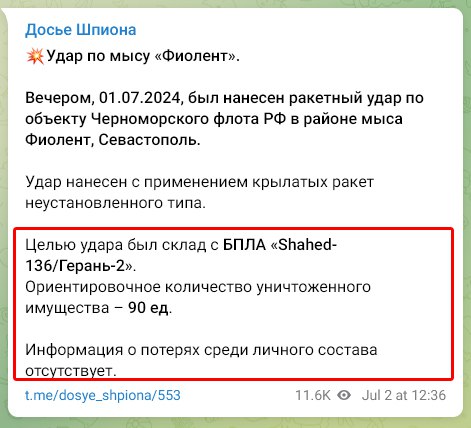 «Удар нанесен с применением крылатых ракет неустановленного типа. Целью удара был склад с БПЛА «Shahed-136/Герань-2». Ориентировочное количество уничтоженного имущества – 90 ед.» — пишет канал.