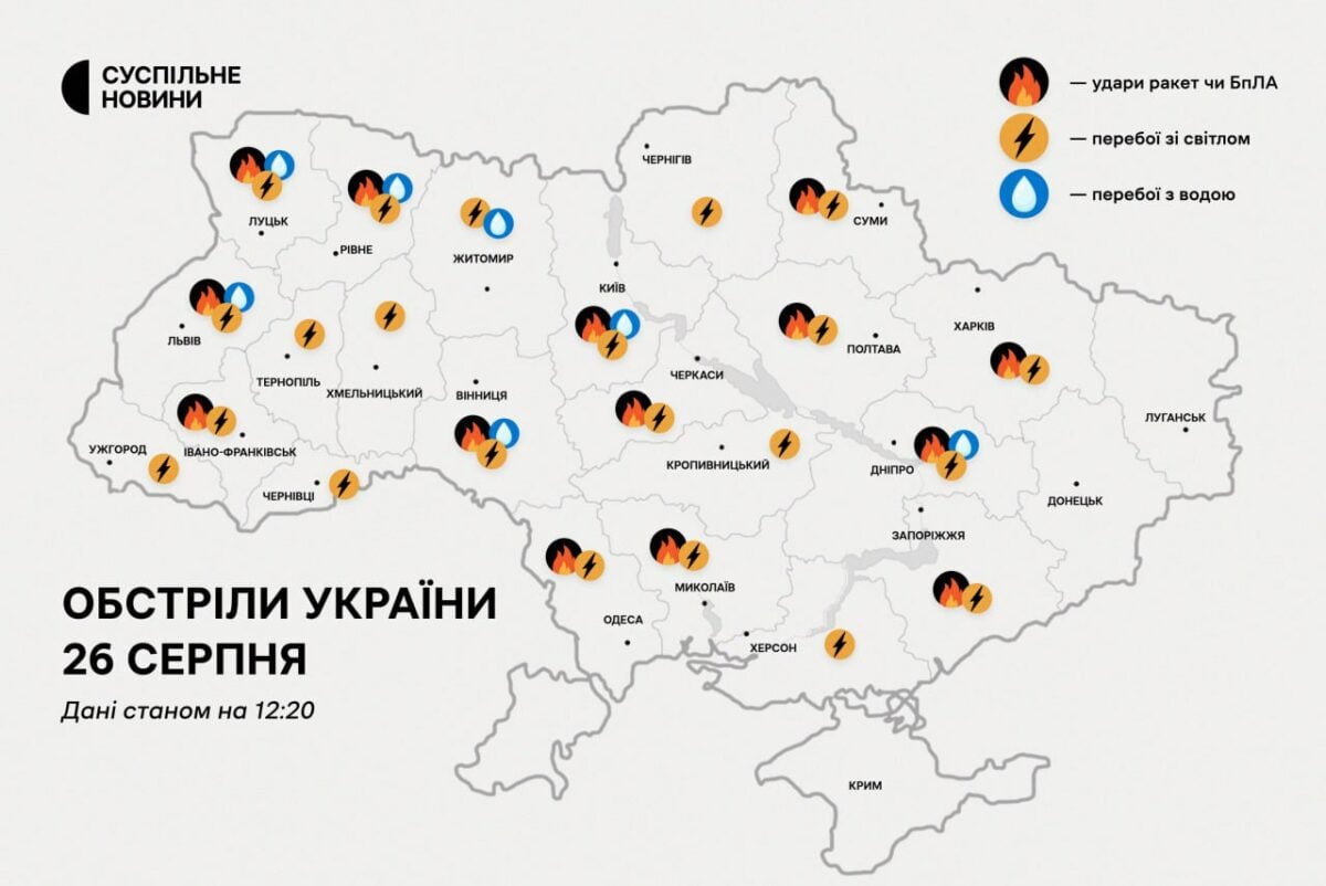 В понедельник, 26 августа, Россия выпустила по Украине ракеты. По всей территории Украины объявлена воздушная тревога.
