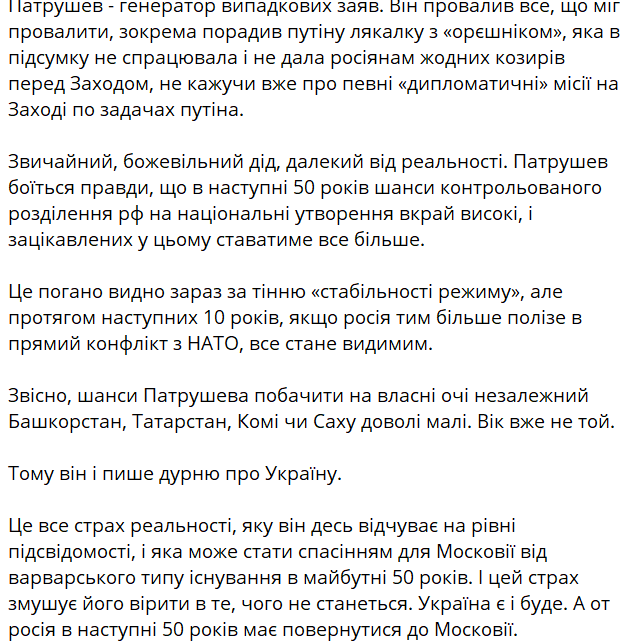 "Конечно, шансы Патрушева увидеть своими глазами независимый Башкортостан, Татарстан, Коми или Саху достаточно малы. Возраст уже не тот. Поэтому он и пишет глупости об Украине. Украина есть и будет. А вот Россия в следующие 50 лет должна вернуться в Московию".