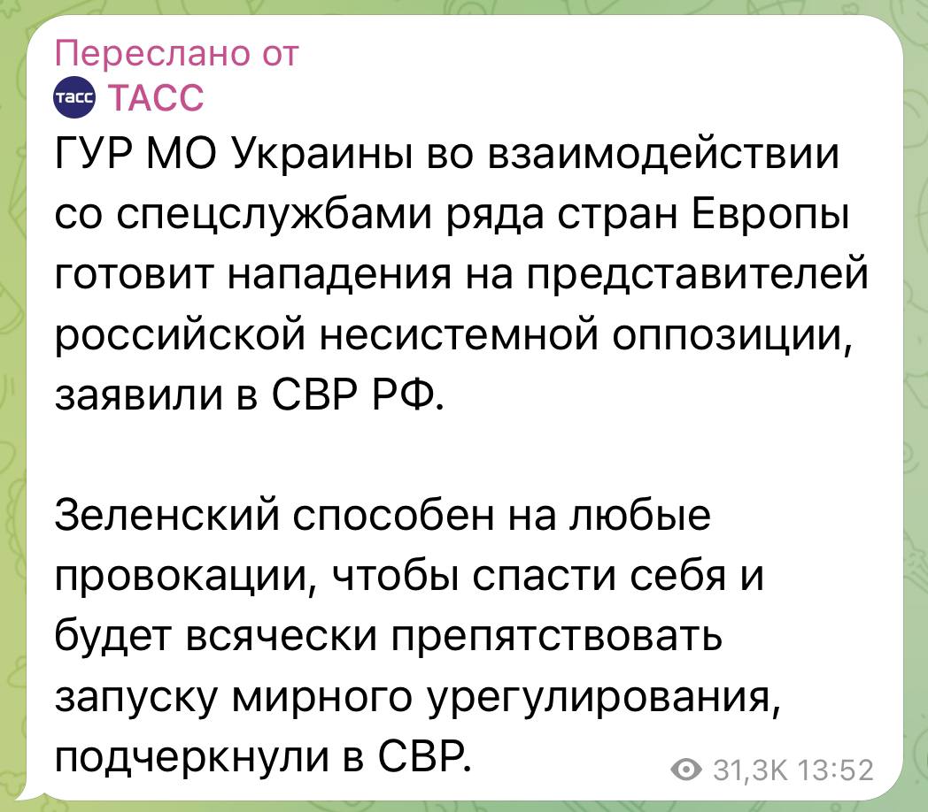 Оппозиционер прикрепил скриншот с сообщением от пропагандистского ТАСС, в котором раздаются заявления якобы от украинской ГУР и европейских спецслужб по поводу убийства политика.