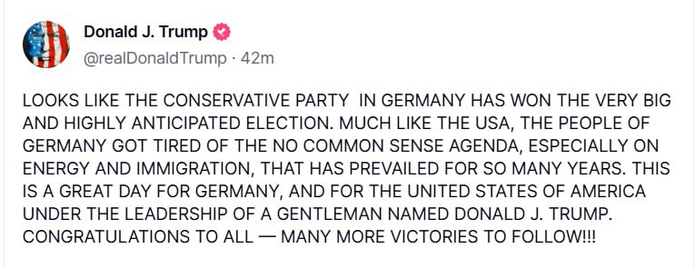 Тем временем Трамп назвал победу ХДС/ХСС и Мерца на выборах в Бундестаг "большим днем" для США