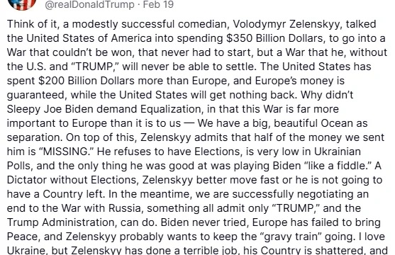 Ранее, после критики со стороны Зеленского относительно встречи между представителями США и России на прошлой неделе, Трамп действительно назвал украинского лидера «диктатором». Его заявление повторяло российскую риторику и было связано с тем, что в Украине не проводили выборы с 2019 года.