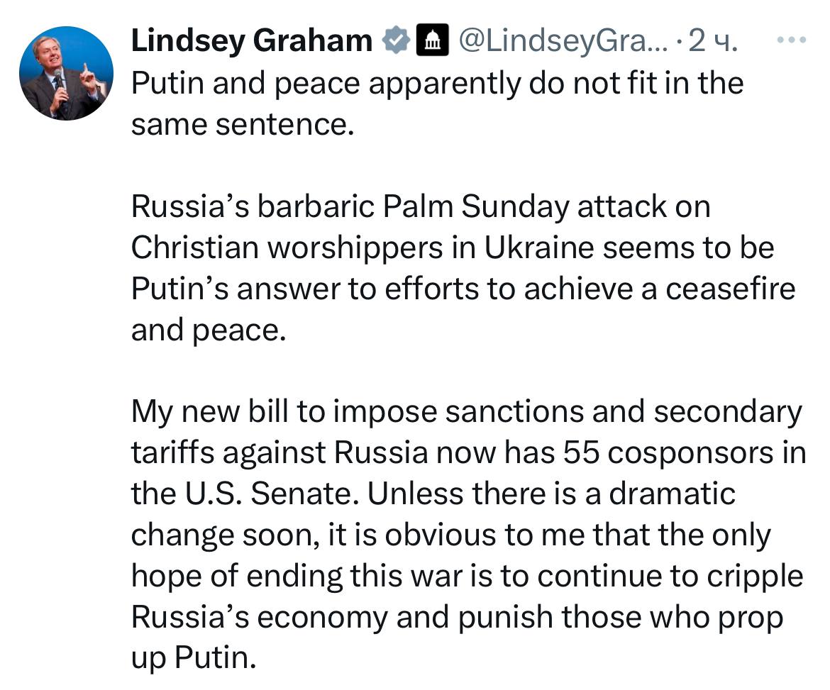 В заметке в X Грэм обвинил Москву в варварском нападении на христианских верующих в Украине. Он назвал атаку на Сумы ответом кремлевского правителя Путина на усилия, направленные на достижение прекращения огня и мира.