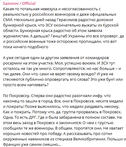 Сазонов отметил, что из-за несогласованности военкоров и руководства с реальностью ситуация выглядит довольно комичной. Он напомнил, что украинские военные сразу опровергли заявление российского Генштаба об освобождении Курщины, однако россияне стояли на своем.