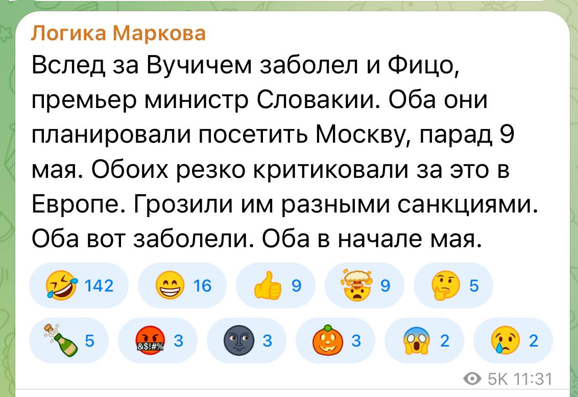 Украинский журналист Денис Казанский поделился скриншотом сообщения из одного из российских Telegram-каналов, в котором говорится о том, что вслед за Вучичем на здоровье пожаловался премьер-министр Словакии Роберт Фицо. Сообщение повеселило Казанского ввиду того, что оба лидера планировали посетить Кремль на парад 9 мая.