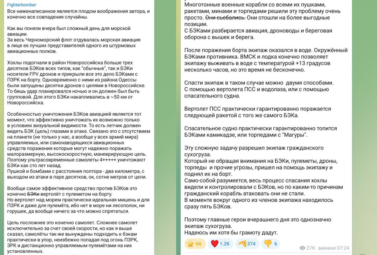 Отмечается, что истребитель был поражен безэкипажным катером (БЭК) ЗУР-Р73 в 50 км от Новороссийска. Как пишет военкор, для поражения украинская сторона применяла тактику «выманил-подловил». Сообщается, что летчики истребителя выжили и их подобрало торговое судно.
