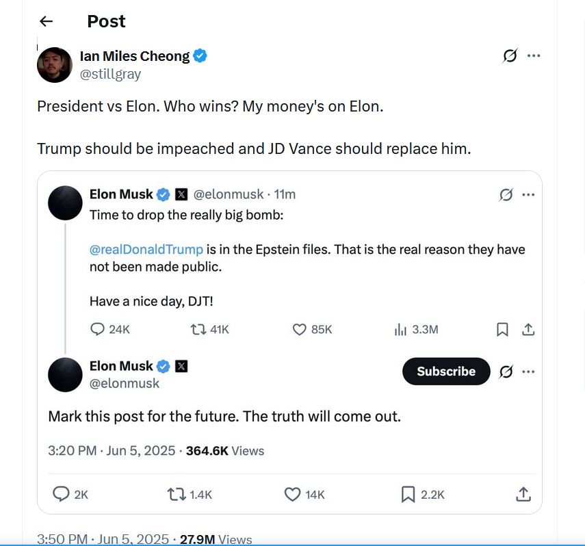 "Президент против Илона. Кто победит? Ставлю на Илона. Трампу нужно объявить импичмент и заменить его [вице-президентом США] Джей Ди Вэнсом", – написал пользователь.