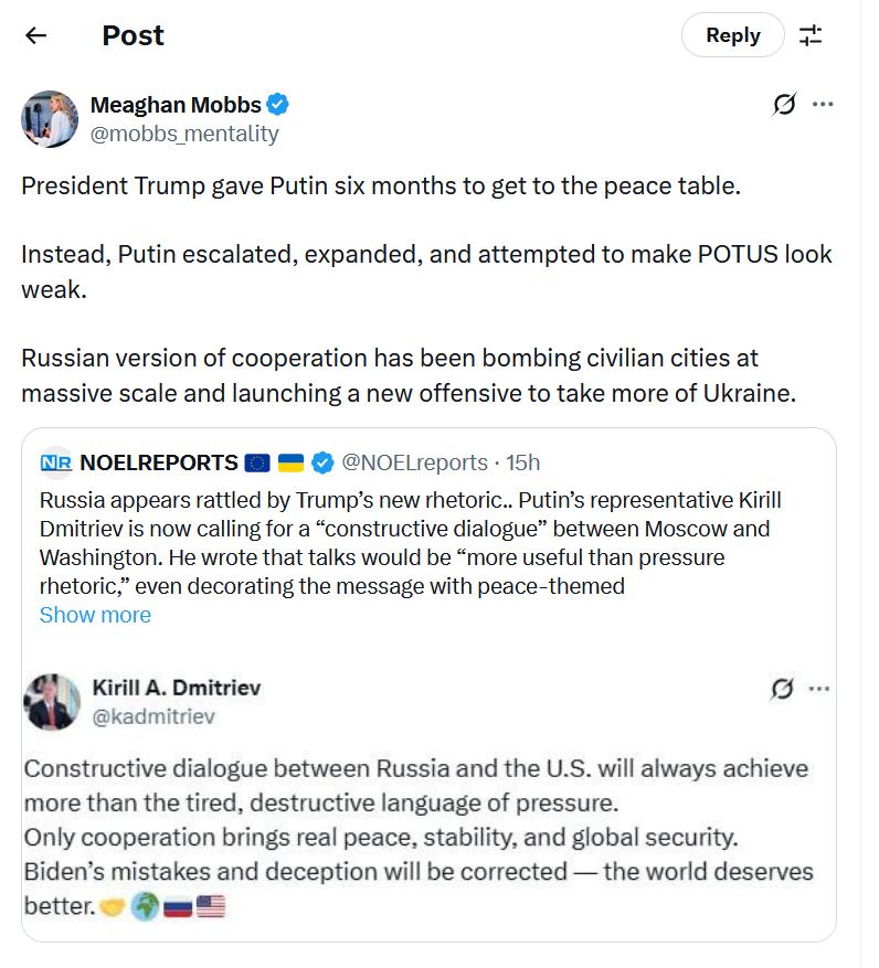 Дочь спецпредставителя президента США по Украине Кита Келлога Меган Моббс, фонд которой помогает Украине, в соцсети Х 14 июля опубликовала скриншот поста спецпредставителя нелегитимного президента страны-агрессора РФ Владимира Путина по инвестиционно-экономическому сотрудничеству Кирилла Дмитриева и прокомментировала его.