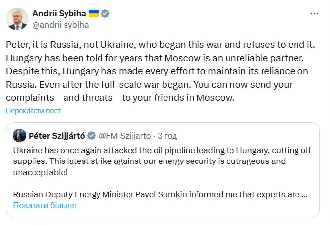 «Венгрия годами говорила, что Москва — ненадежный партнер. Несмотря на это, Венгрия прилагает все усилия, чтобы сохранить свою зависимость от России. Даже после начала полномасштабной войны. Теперь вы можете отправлять свои жалобы и угрозы — своим друзьям в Москве», — написал Сибига в соцсети Х.