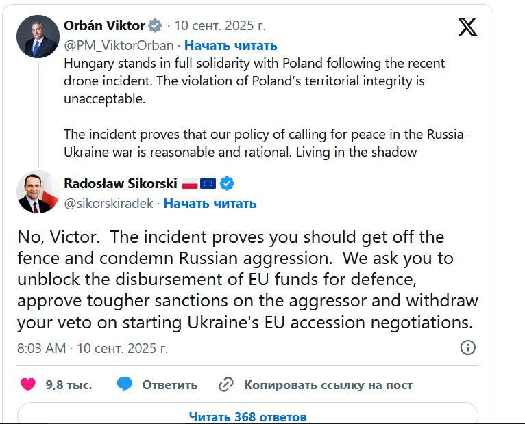 Министр иностранных дел Польши Радослав Сикорский в социальной сети Х ответил на сообщение премьер-министра Венгрии Виктора Орбана, в котором тот выразил солидарность с Польшей из-за нарушения ее воздушного пространства российскими дронами 10 сентября.