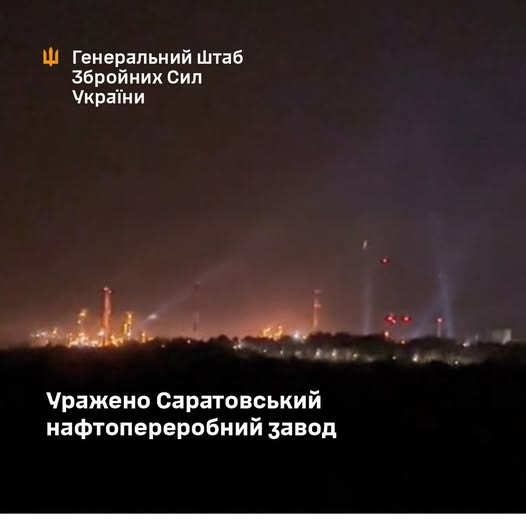 В ночь на 16 сентября подразделения Сил специальных операций ВСУ нанесли удар по Саратовскому нефтеперерабатывающему заводу в России. Об этом сообщает Генштаб ВСУ.