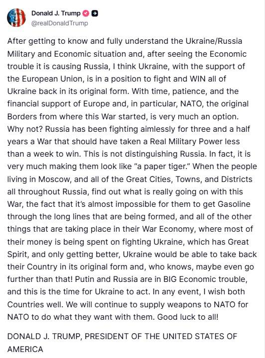 «После того, как я полностью понял военную и экономическую ситуацию между Украиной и Россией, а также увидел экономические проблемы, которые она создает для России, я считаю, что Украина при поддержке Европейского Союза находится в позиции, чтобы бороться и ВЫИГРАТЬ, вернув все свои земли», — написал Трамп.