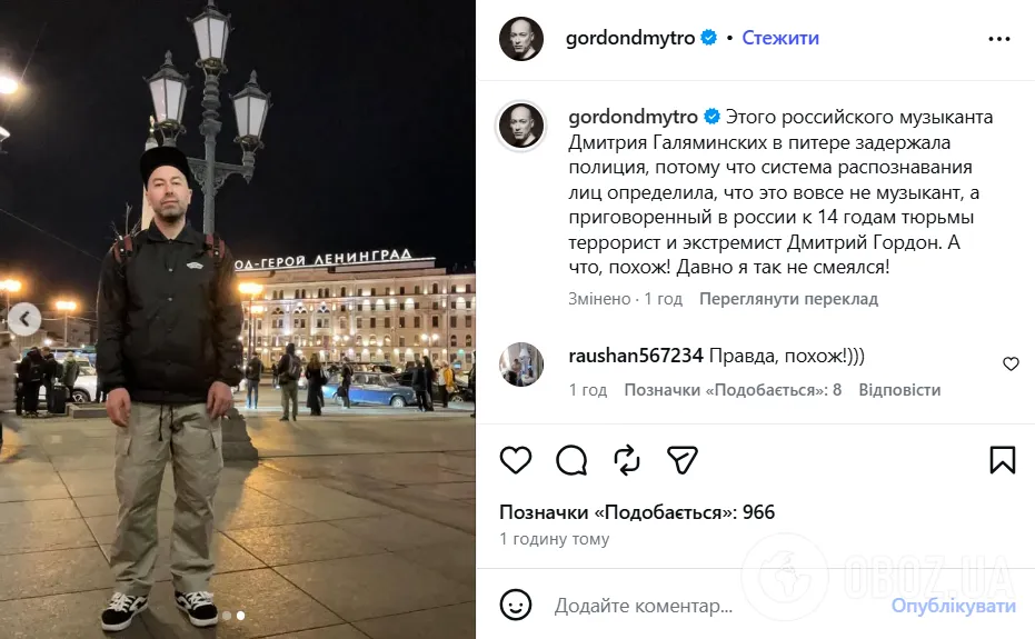 "Этого российского музыканта Дмитрия Галяминских в Санкт-Петербурге задержала полиция, поскольку система распознавания лиц определила, что это вовсе не музыкант, а осужденный в России к 14 годам заключения террорист и экстремист Дмитрий Гордон. А что, похож! Давно я так не смеялся!", – написал журналист.